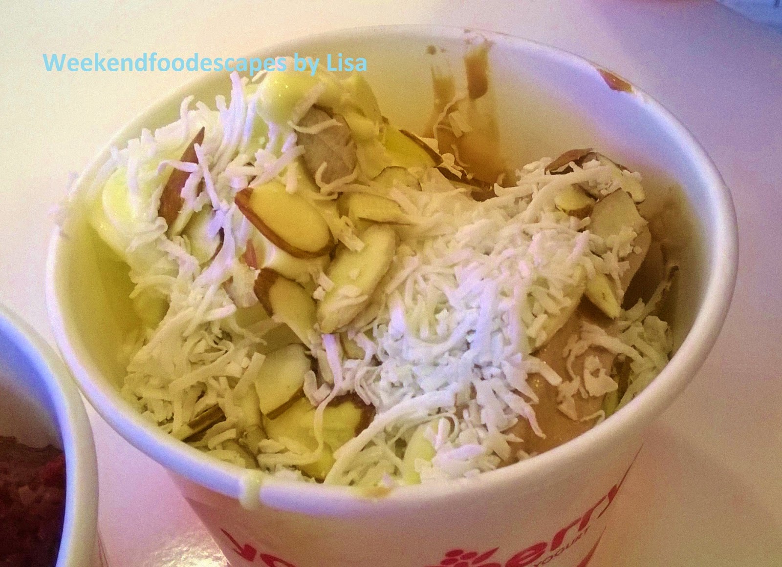 I quite liked the combination of chocolate and coconut frozen yoghurt topped with shreds of coconut and almonds. Simple, classic flavours and different textures really make this combination work.